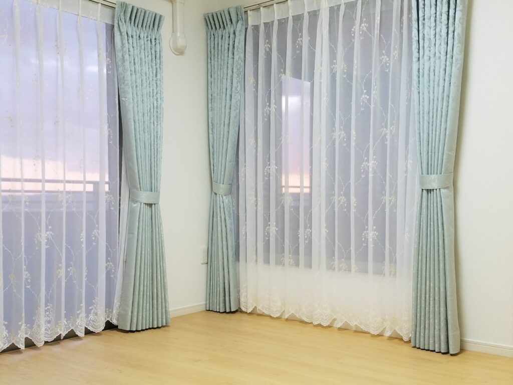 清潔感があるブルーのドレープとレースのカーテンです。